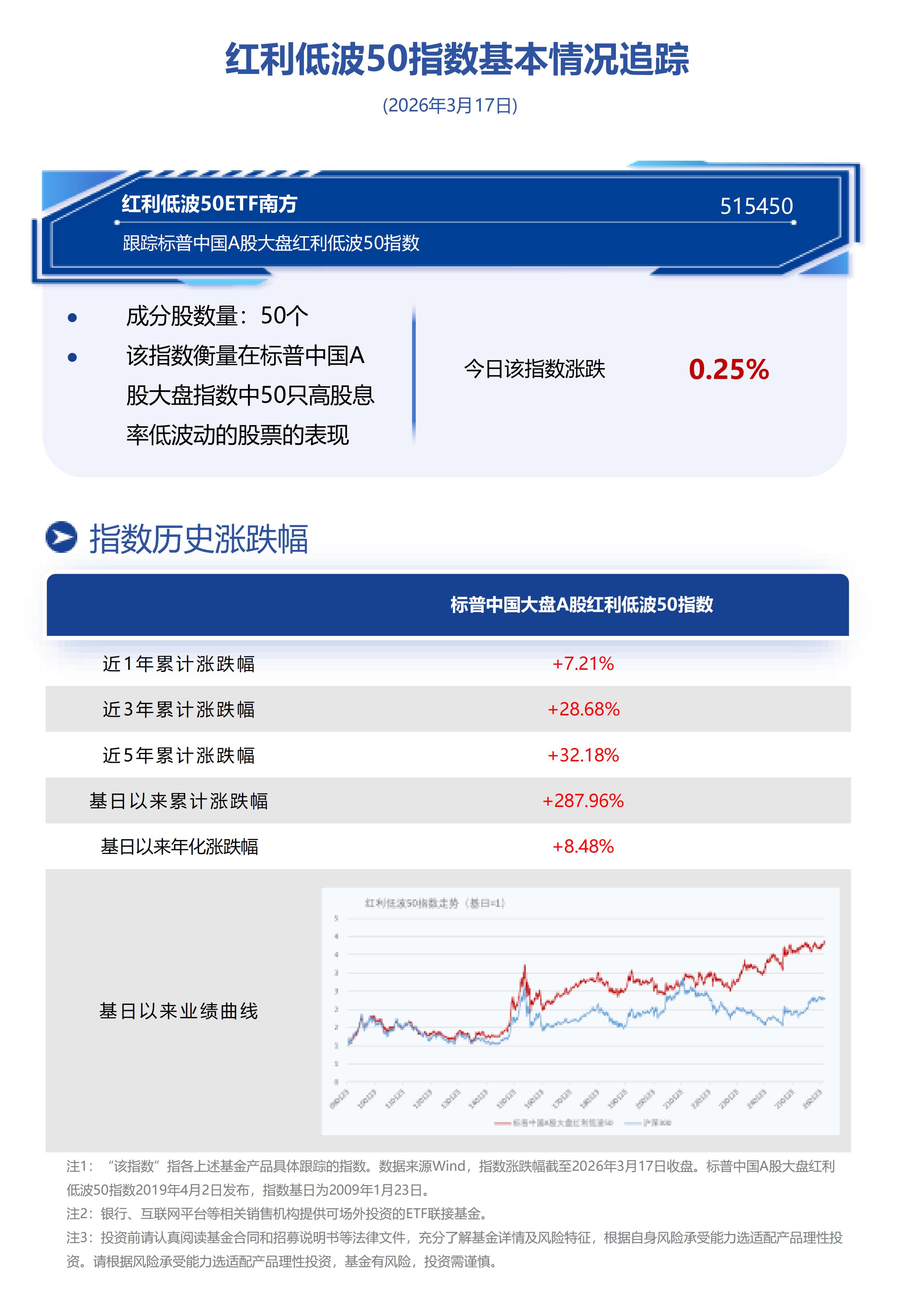 红利低波50ETF(515450.SH)跟踪标普中国A股大盘红利低波50指数,指数编制过程中在样本空间、行业分类等方面具备独特性,相比同类指数行业分布更加均衡、超配电力及大消费板块,长期风险收益表现领先。截至2026年3月16日,据Wind,红利低波50股息率按整体法计算为4.48%,红利低波50股息性价比仍存。