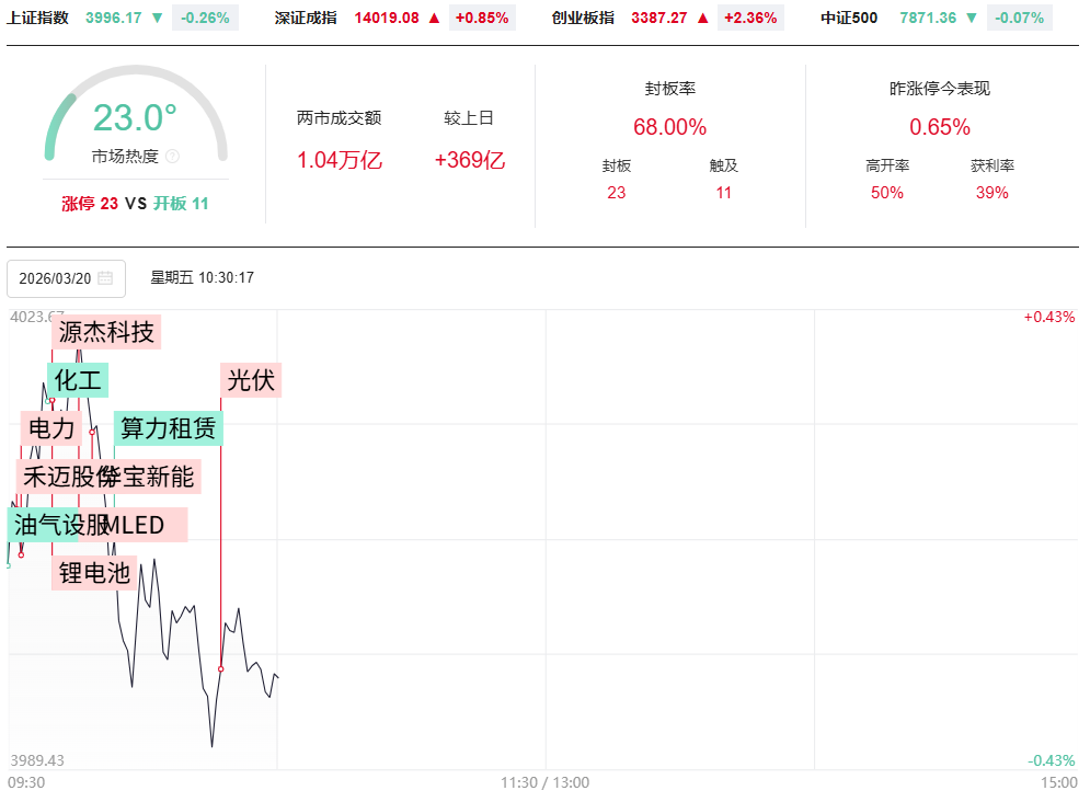 三大指数涨跌不一,沪指震荡回落再度破4000点关口。创业板指在新易盛、中际旭创权重的带领下,高开高走涨超2%。大小指数分化严重,中小盘股普跌,微盘股指数跌超2%。成交量方面,第一个小时两市放量441亿元,预计全天成交2.2万亿。当前下跌个股超4000家。板块方面,算力硬件概念集体爆发,源杰科技20CM涨停,新易盛涨超10%创历史新高。短线情绪分化,华电能源、华电辽能、长源电力、广西能源等多只电力股炸板回落。