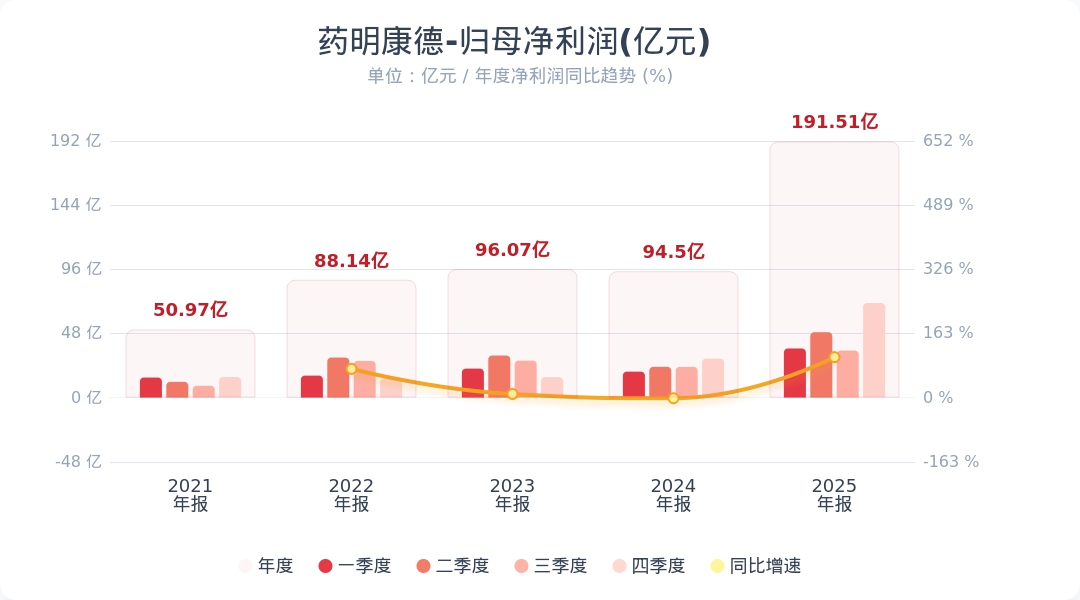 财联社3月23日电,药明康德(603259.SH)发布年报,公司2025年实现营业收入454.56亿元,同比增长15.84%;归属于上市公司股东的净利润为191.51亿元,同比增长102.65%。公司拟向全体股东每10股派发现金红利15.7927元(含税),合计派现约47.12亿元。小财注:Q3净利润35.15亿,据此计算,Q4净利润70.75亿,环比增长101%。
