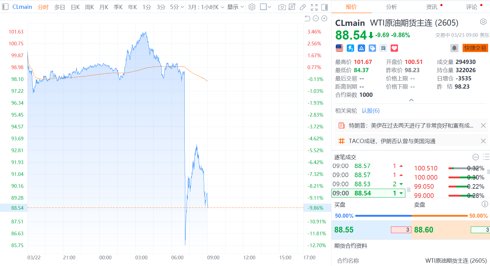 财联社3月23日电,WTI原油跌10.10%,报88.312美元/桶;布伦特原油跌9.73%,报96.059美元/桶。此前美国总统特朗普称,美方“非常有意向与伊朗达成协议”;美方与伊朗的讨论“非常激烈”,他“对能够达成某些实质性成果抱有希望”。