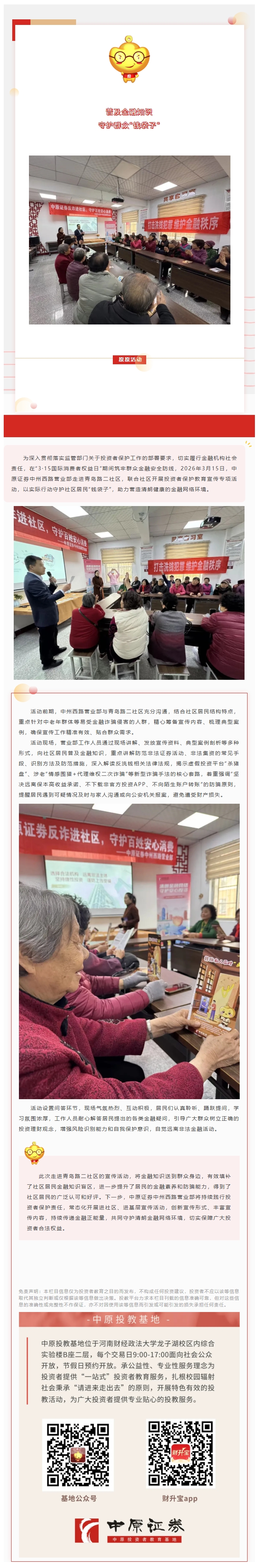 3·15护权益 | 普及金融知识 守护群众“钱袋子” —— 中原证券洛阳中州西路营业部走进青岛路二社区