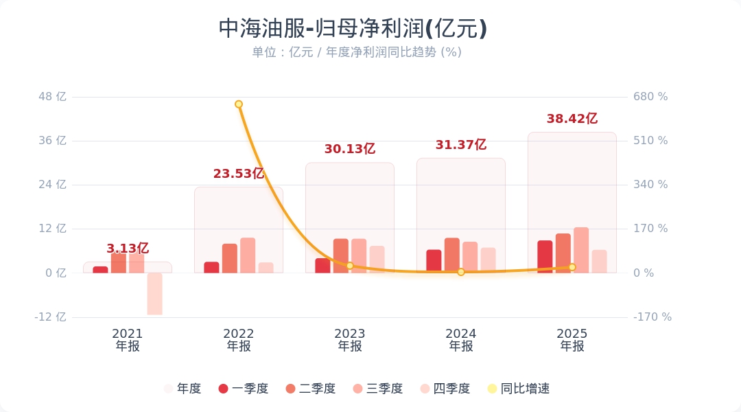 财联社3月24日电,中海油服(601808.SH)披露年报,2025年实现营业收入502.83亿元,同比增长4.1%;归母净利润38.42亿元,同比增长22.5%;基本每股收益0.81元。公司拟每10股派发现金红利2.825元(含税)。2025年,全球油气勘探支出呈现“总量温和增长、结构区域调整”特点。在新发展环境下,公司优化海内外市场资源配置,拓展“平台+”“船舶+”“技术+”等新业态,保障产业链供应链稳定安全,推动公司业绩稳定增长。小财注:中海油服2025年Q3净利润12.46亿元,据此计算,Q4净利润6.32亿元,环比下降49%。