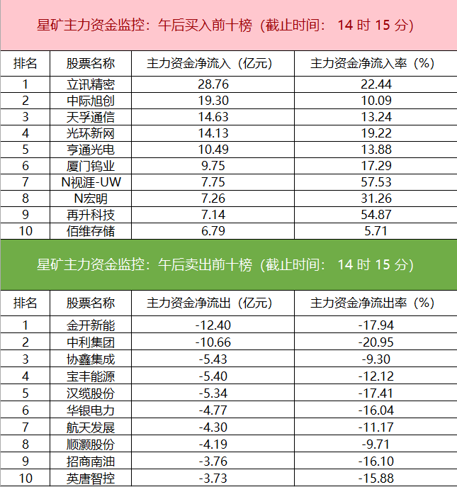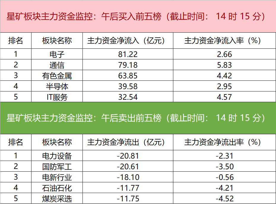 财联社3月25日电,财联社星矿数据显示,今日主力资金净流入电子、通信、有色金属等板块,净流出电力设备、国防军工、电新行业等板块,其中电子板块净流入超81亿元。个股方面,立讯精密资金净买入28.76亿元位居首位,中际旭创、天孚通信、光环新网主力资金净流入居前;金开新能遭净卖出超12亿元位居首位,中利集团、协鑫集成、宝丰能源主力资金净流出额居前。