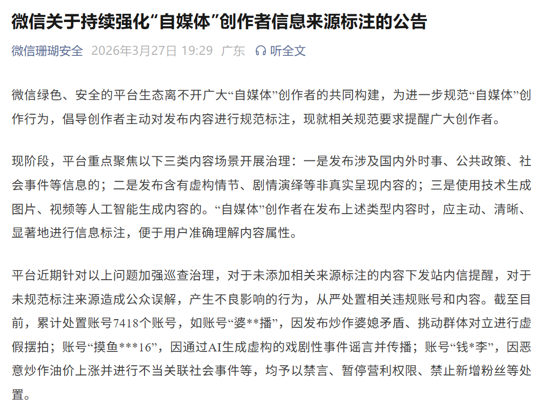 财联社3月27日电,据微信珊瑚安全公众号消息,微信发布关于持续强化“自媒体”创作者信息来源标注的公告。公告称,现阶段,平台重点聚焦以下三类内容场景开展治理:一是发布涉及国内外时事、公共政策、社会事件等信息的;二是发布含有虚构情节、剧情演绎等非真实呈现内容的;三是使用技术生成图片、视频等人工智能生成内容的。“自媒体”创作者在发布上述类型内容时,应主动、清晰、显著地进行信息标注,便于用户准确理解内容属性。