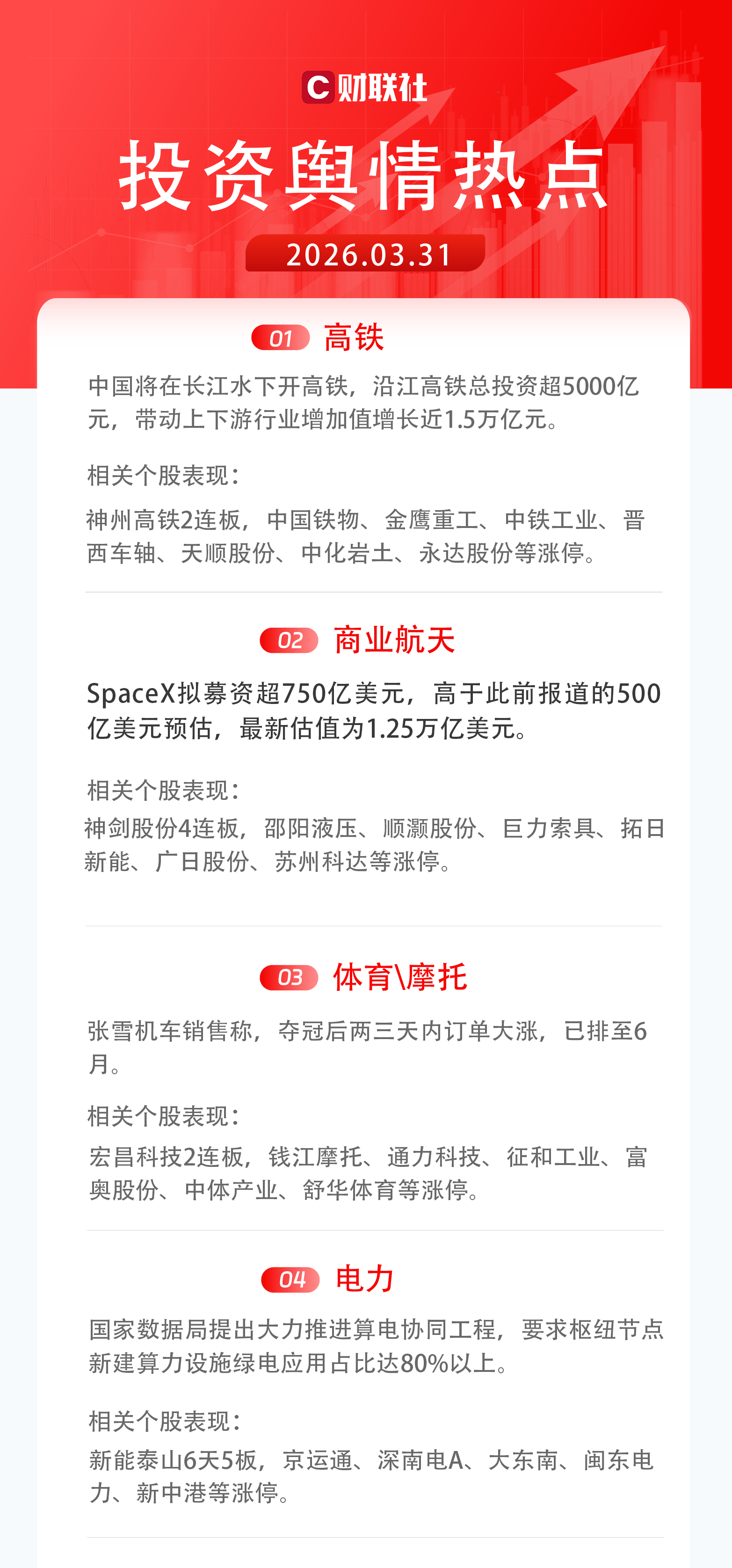 1)高铁:中国将在长江水下开高铁,沿江高铁总投资超5000亿元,带动上下游行业增加值增长近1.5万亿元。