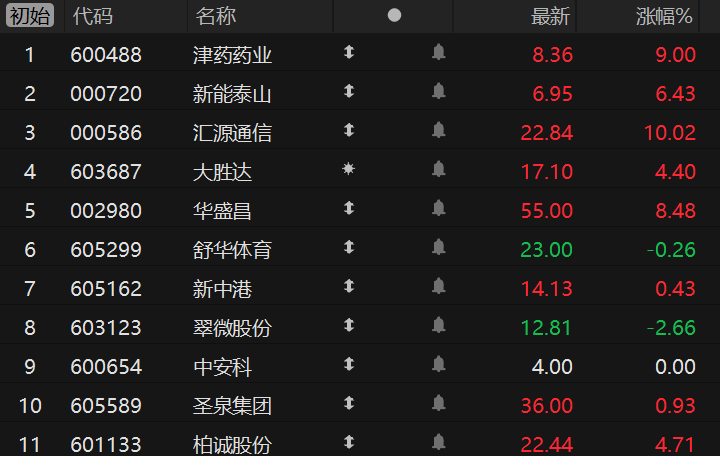 财联社4月8日电,市场焦点股津药药业(7板)高开9.00%,光纤概念股新能泰山(10天8板)高开6.43%、汇源通信(3板)竞价涨停,并购重组的大胜达(14天7板)高开4.40%、华盛昌(6天3板)高开8.48%,体育产业链的舒华体育(12天6板)低开0.26%,电力股新中港(5天4板)高开0.43%,跨境支付概念股翠微股份(2板)低开2.66%,算力板块中安科(2板)平开,芯片产业链的圣泉集团(2板)高开0.93%、柏诚股份(4天2板)高开4.71%。