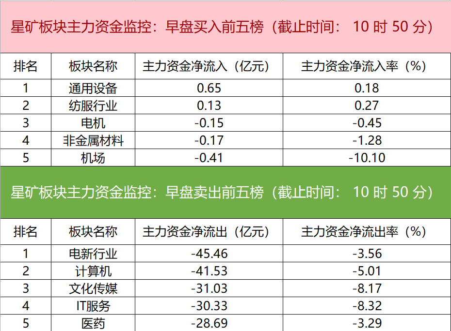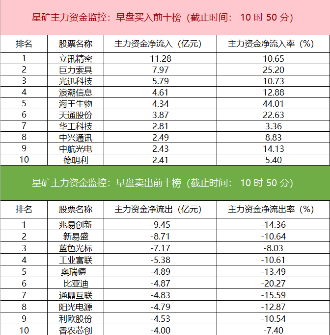 财联社4月9日电,财联社星矿数据显示,今日早盘主力资金净流入通用设备和纺服行业板块,净流出电新行业、计算机、文化传媒等板块,其中电新行业净流出超45亿元。个股方面,立讯精密大涨,主力资金净买入超11.28亿元位居首位,巨力索具、光迅科技、浪潮信息获主力资金净流入居前;兆易创新遭净卖出超9亿元,新易盛、蓝色光标、工业富联资金净流出额居前。