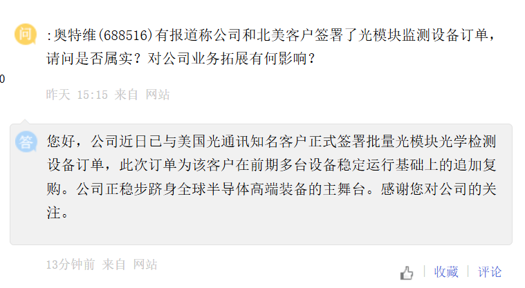 奥特维:近日已与美国光通讯知名客户正式签署批量光模块光学检测设备订单