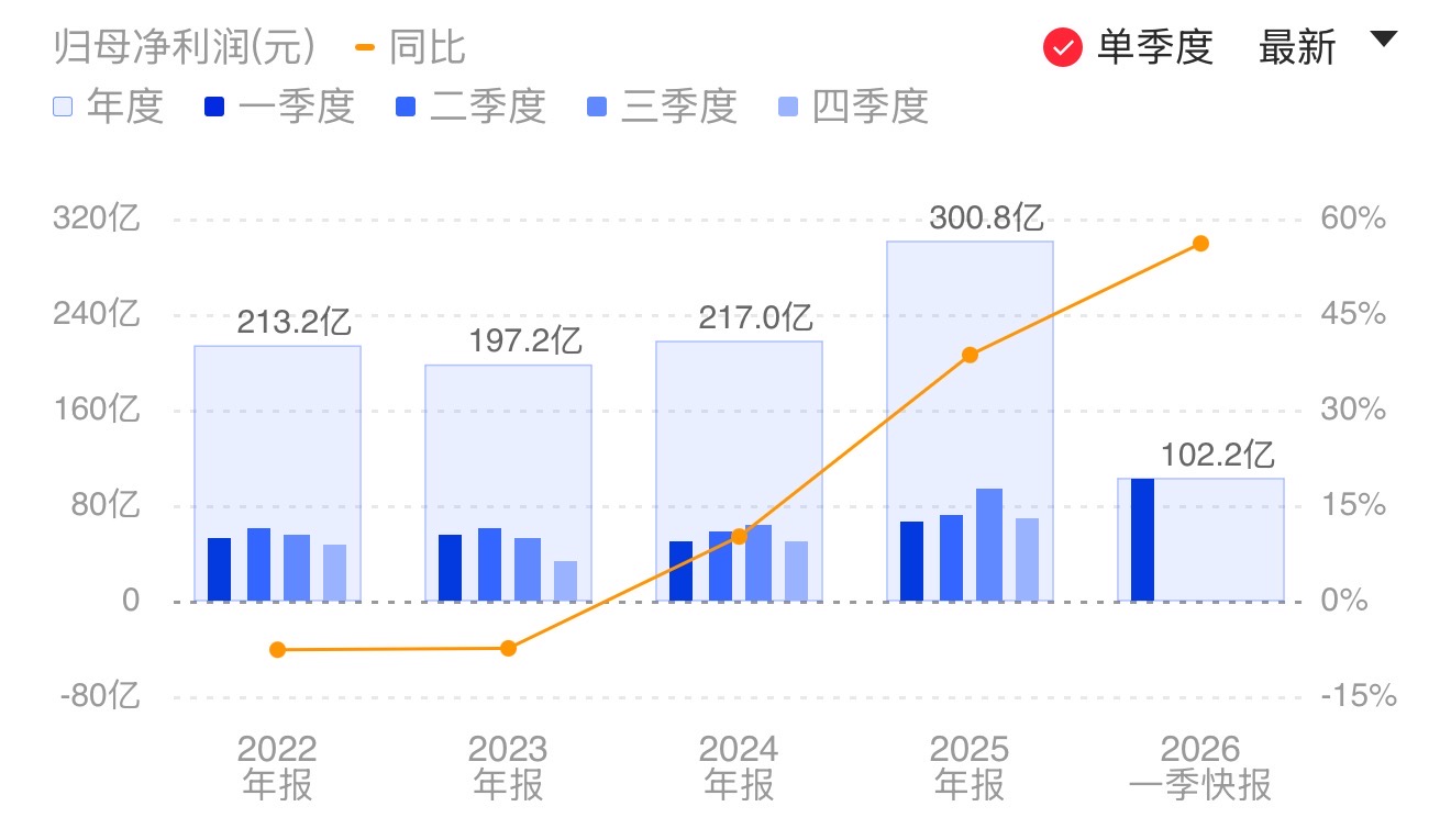 财联社4月9日电,中信证券(600030.SH)发布业绩快报,2026年第一季度实现营业收入231.55亿元,同比增长40.91%;归属于上市公司股东的净利润为102.16亿元,同比增长54.60%。2026年一季度,资本市场保持良好发展态势,交易活跃度维持高位水平,公司积极把握市场机会,各项业务协同发力、稳步发展,推动经营业绩实现较快增长。小财注:中信证券2025年Q4净利69.17亿元,据此计算,2026年Q1净利环比增长47.46%。