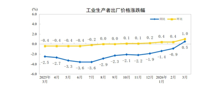 国家统计局:3月全国工业生产者出厂价格同比上涨0.5% 环比上涨1.0%