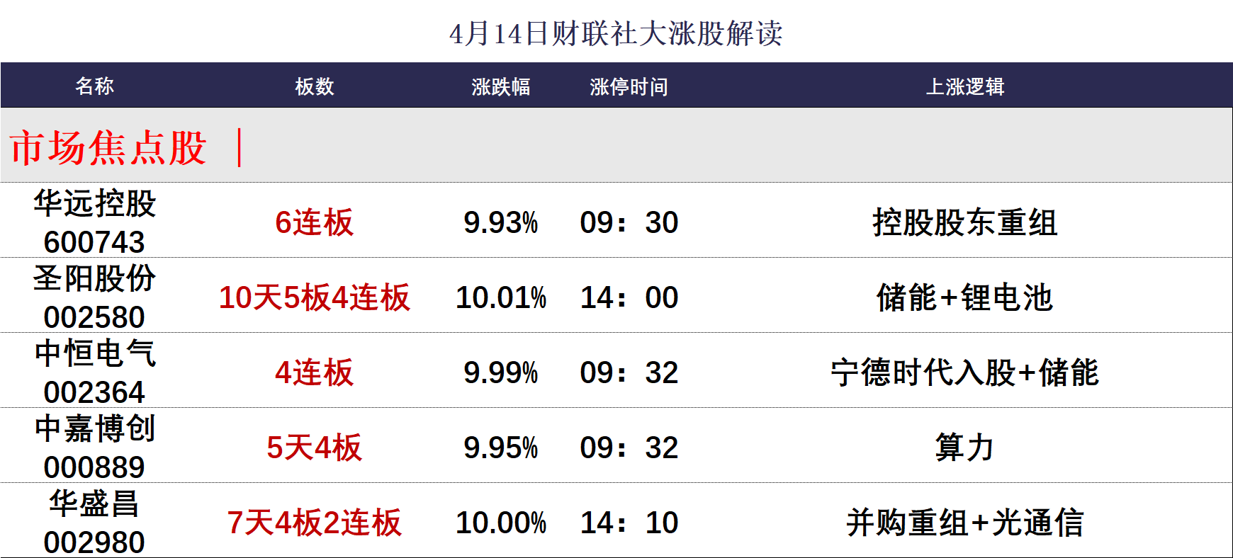 财联社4月14日电,今日全市场共55股涨停,连板股总数10只,18股封板未遂,封板率为75%(不含ST股、退市股)。焦点股方面,控股股东重组的华远控股6连板,储能板块圣阳股份4连板、中恒电气4连板,算力租赁概念股中嘉博创5天4板,光通信板块华盛昌7天4板。