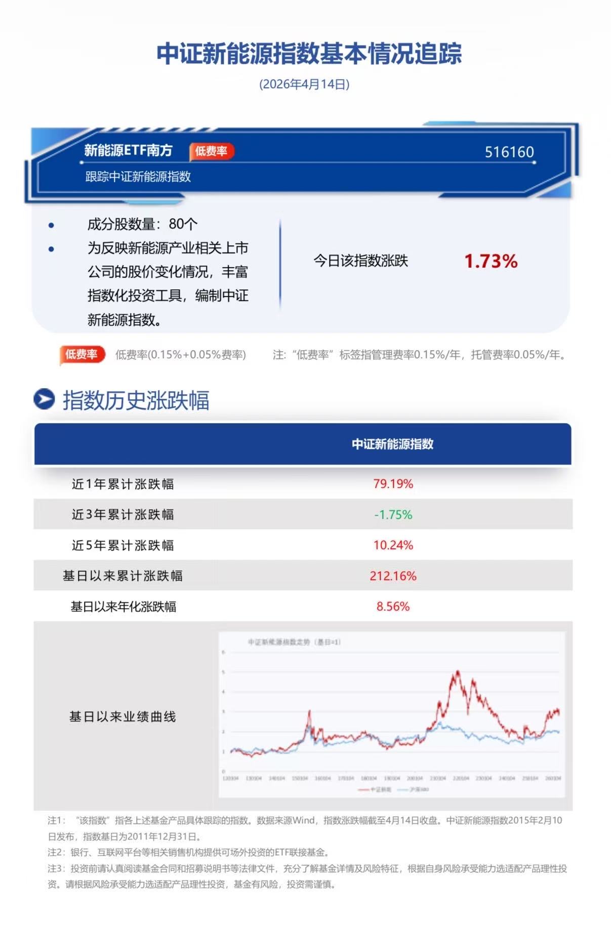 截至2026年4月14日收盘,新能源ETF南方(516160)换手4.04%,成交3.26亿元,跟踪标的指数中证新能源指数(399808)涨1.73%。