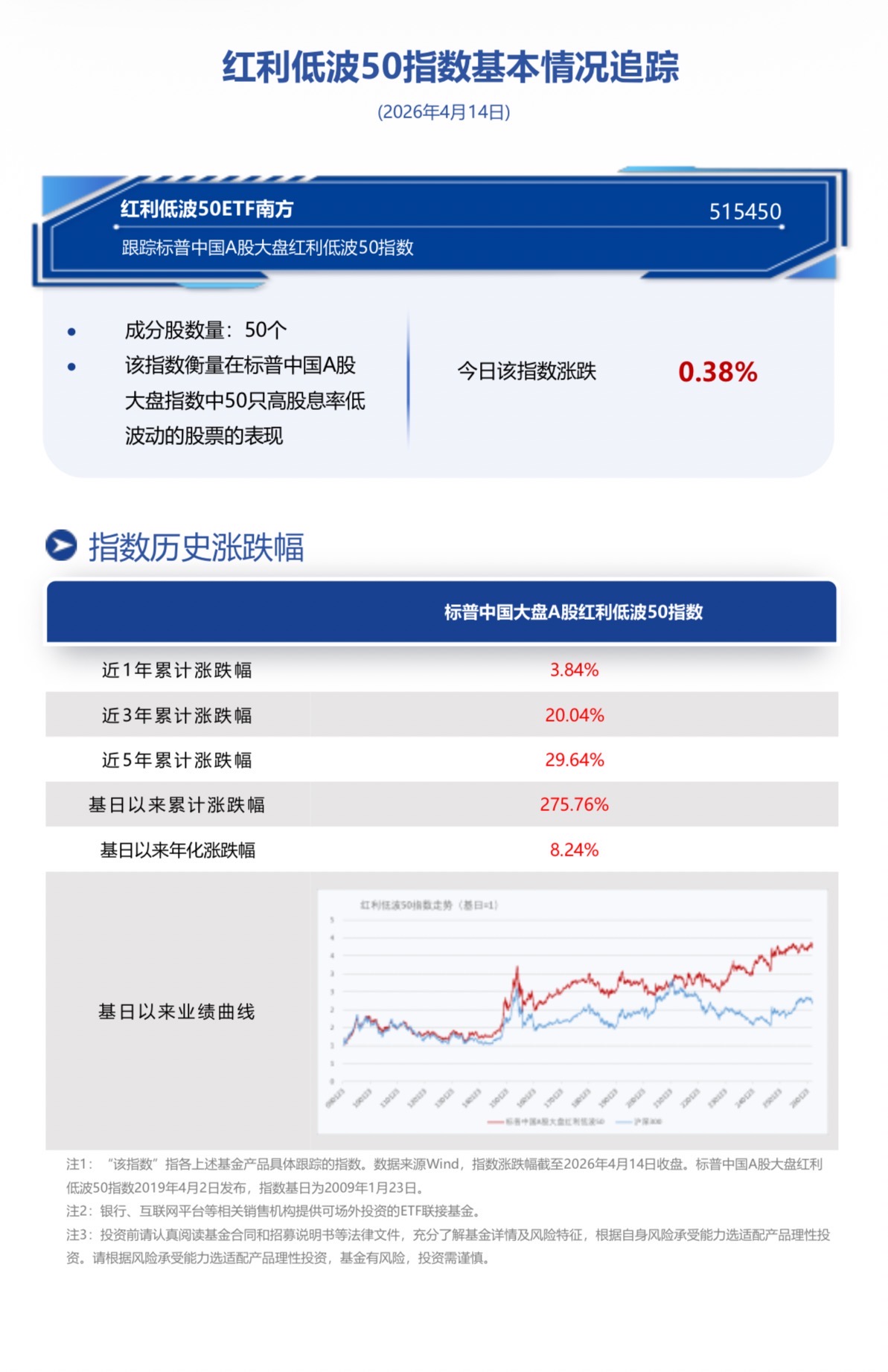 截至2026年4月14日收盘,红利低波50ETF南方(515450)换手1.12%,成交1.87亿元,跟踪标的指数标普中国A股大盘红利低波50指数(SPCLLHCP) 涨0.38%。