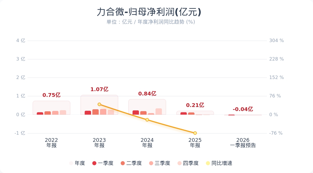 《科创板日报》14日讯,力合微(688589.SH)公告称,预计2026年第一季度归属于母公司所有者的净利润亏损300万元至450万元。业绩变动主要系智能电网市场供货节奏影响,该板块收入确认不及预期,导致公司净利润及扣非净利润出现亏损。小财注:Q1净利润预计亏损0.03亿-亏损0.04亿,Q4净利润-0.02亿,据此计算,Q1净利润预计持续亏损。