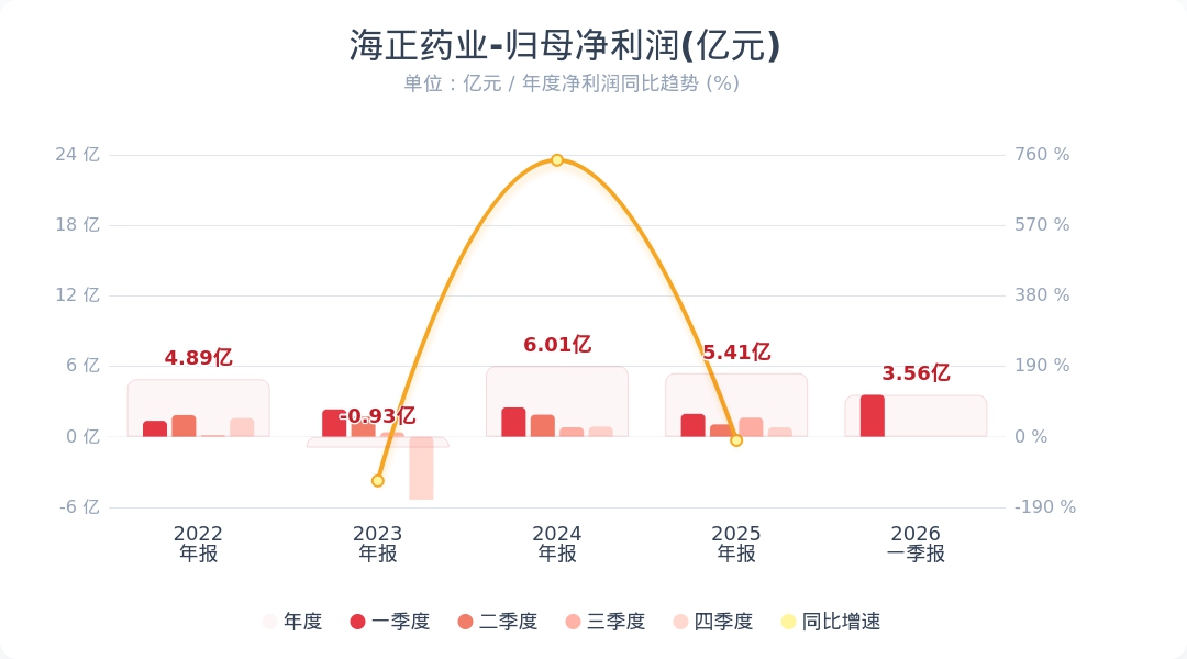 财联社4月15日电,海正药业(600267.SH)公告称,公司2026年第一季度实现营业收入23.90亿元,同比下降9.17%;归属于上市公司股东的净利润为3.56亿元,同比增长83.13%。业绩变动主要系转让子公司股权致非经常性损益增加,以及医药制剂销售增长、生产降本增效等因素影响。小财注:公司Q1净利润3.56亿,2025年Q4净利润0.8亿,据此计算,Q1净利润环比增长345%。