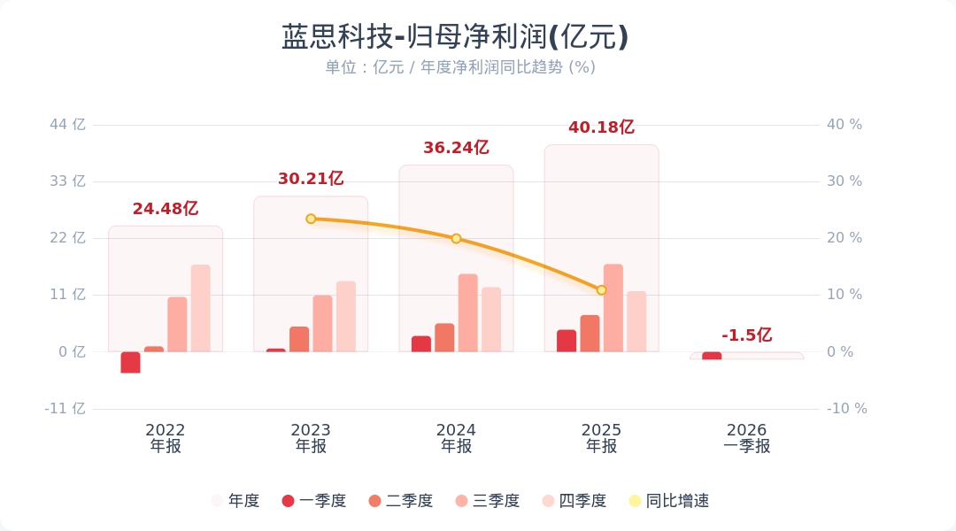 财联社4月15日电,蓝思科技(300433.SZ)公告称,2026年第一季度实现营业收入141.40亿元,同比下降17.13%;归属于上市公司股东的净利润为-1.50亿元,同比转亏。业绩变动主要系本期智能手机与电脑类收入减少,以及本期汇兑净损失增加、远期结售汇估值损失增加所致。小财注:公司Q1净利润-1.5亿,2025年Q4净利润11.75亿,据此计算,Q1净利润由盈转亏。