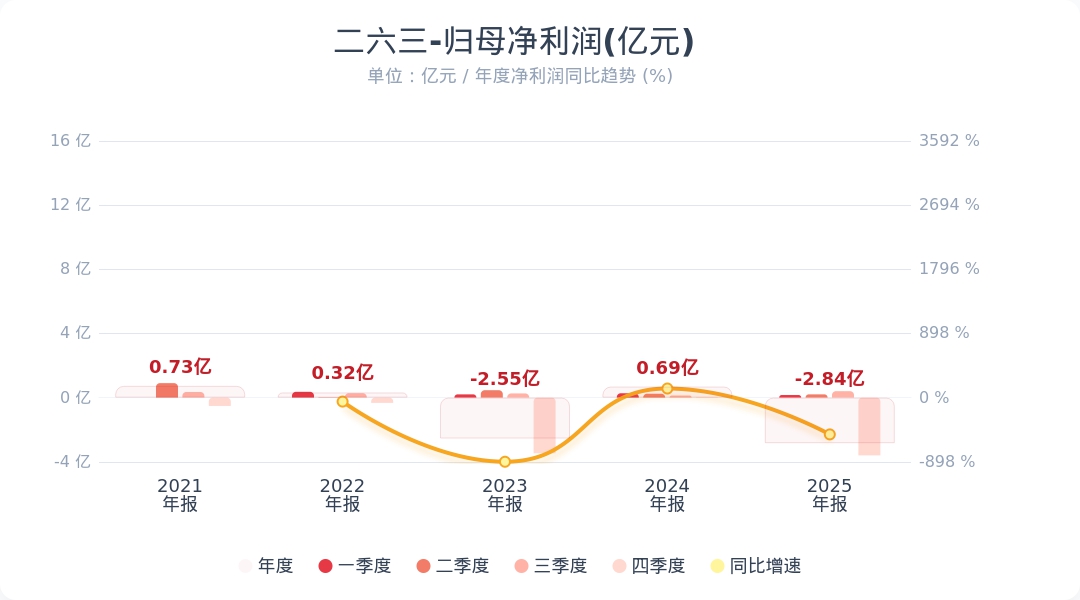 财联社4月16日电,二六三(002467.SZ)发布2025年年度报告,实现营业收入7.97亿元,同比下降8.12%;归属于上市公司股东的净利润为-2.84亿元,较2024年净利润6853.63万元由盈转亏。公司计划不派发现金红利,不送红股,不以公积金转增股本。小财注:公司Q4净利润-3.6亿,Q3净利润0.4亿,据此计算,Q4净利润由盈转亏。