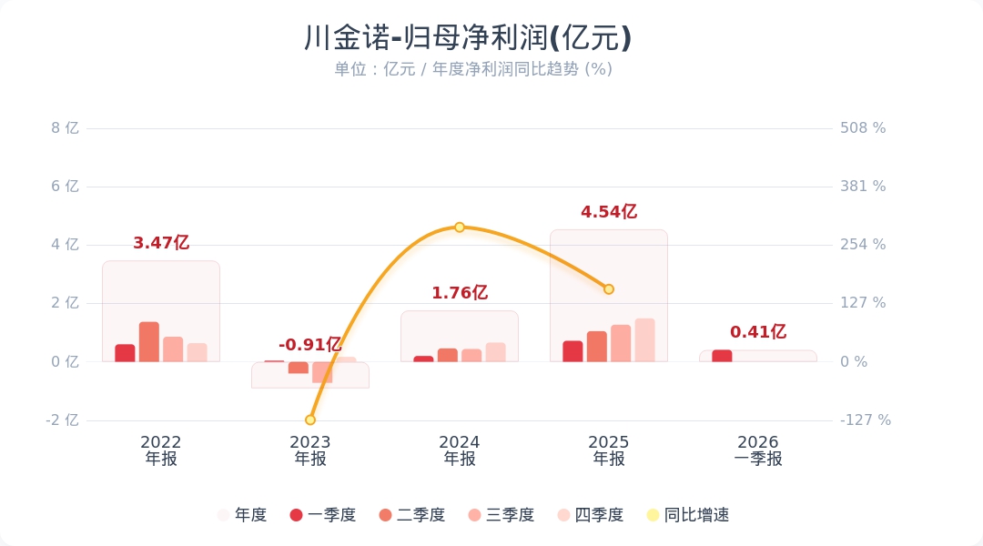 财联社4月16日电,川金诺(300505.SZ)公告称,2026年第一季度实现营业收入9.90亿元,同比增长37.37%;归属于上市公司股东的净利润为4115.70万元,同比下降42.85%。业绩变动主要系公司产品售价及销量均较上年同期增长所致。小财注:公司Q1净利润0.41亿,2025年Q4净利润1.49亿,据此计算,Q1净利润环比下降72%。