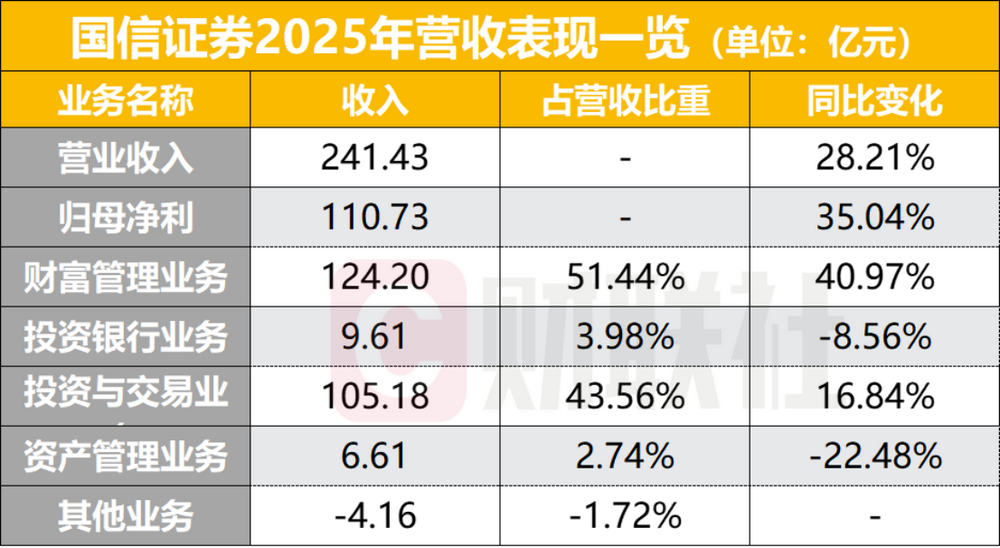 国信证券发布的2025年度报告显示,公司全年实现营业收入241.43亿元,同比增长28.21%;归母净利润110.73亿元,同比增幅达35.04%。在43家上市券商中,归母净利润排名第七。