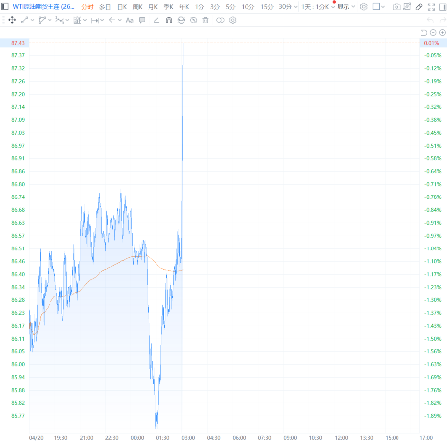 财联社4月21日电,国际油价直线拉升,WTI原油期货转涨,抹去此前2%的跌幅。