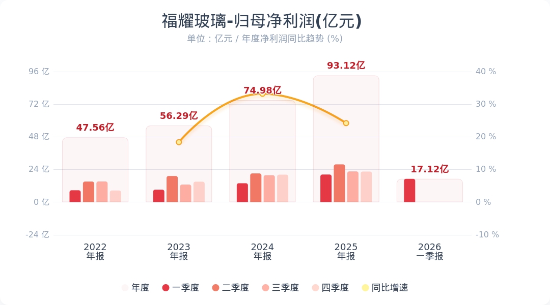 财联社4月21日电,福耀玻璃(600660.SH)公告称,2026年第一季度实现营业收入104.13亿元,同比增长5.08%;归属于上市公司股东的净利润为17.12亿元,同比下降15.68%。业绩变动主要由于汇兑损益的影响,本报告期汇兑损失人民币4.39亿元,上年同期汇兑收益人民币2.36亿元。小财注:公司Q1净利润17.12亿,2025年Q4净利润22.48亿,据此计算,Q1净利润环比下降23%。