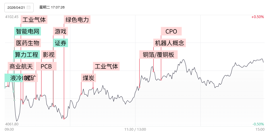 财联社4月22日电,上个交易日市场探底回升,三大指数集体收红,创业板指此前一度跌超1.5%。全市场超3400只个股下跌。沪深两市成交额2.41万亿,较前日缩量1702亿。1)4月20日,国内太空算力公司北京轨道辰光宣布,近日完成PreA1轮股权融资,以及多项债权融资和银行授信协议,股债权融资金额共计577亿元人民币。商业航天概念继续受到多重利好提振,轨道辰光影子股顺灏股份缩量走出T字涨停,低位小票金螳螂、中衡设计实现连板晋级,多波人气股神剑股份、巨力索具双双涨停。2)国新办举行新闻发布会,工信部表示,正在开展算电协同政策研究和标准制定,绿电产业链受此消息刺激,全天大放异彩,粤电力A、浙江新能、华电辽能、宝新能源等纷纷涨停。3)受益Rubin服务器将采用M9级CCL基材对HVLP4需求放量,以及光模块向1.6T高速产品的升级,铜箔概念大放异彩,方邦股份、英联股份双双涨停,德福科技大涨超15%。4)有“黄金气体”之称的氦气大幅涨价。据卓创资讯数据,4月20日氦气价格达到1157.14元/瓶,单日涨幅接近15%。工业气体概念全天强势,华特气体录得20厘米涨停,广钢气体、金宏气体双双涨超10%,前日报收20厘米涨停的空分设备股蜀道装备盘中一度冲高涨超10%。