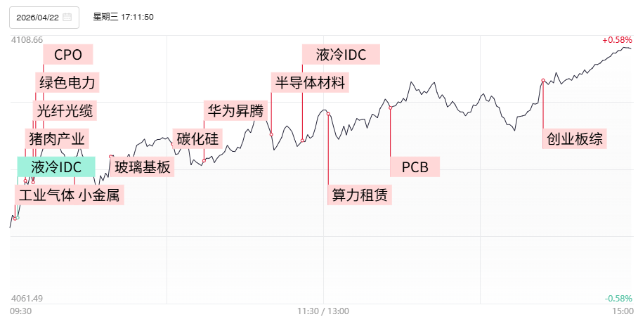 财联社4月23日电,上个交易日市场低开高走,沪指重返4100点,创业板指、深成指均涨超1%。创业板综指创历史新高,突破2015年6月3日的高点。全市场超2900只个股上涨。沪深两市成交额2.56万亿,较前日放量1512亿。1)集邦咨询预测,全球AI光收发模块市场规模预计将从2025年的165亿美元增至2026年的260亿美元,同比增幅超过57%。CPO概念热度居高不下,权重核心中际旭创总市值逼近1万亿,新易盛总市值突破6000亿。近期火热的上游光芯片等环节则继续得到资金聚焦,长光华芯录得20厘米涨停,东山精密强势涨停,总市值突破3400亿。而随着磷化铟概念人气龙头云南锗业以及铌酸锂概念天通股份双双反包涨停录得4天3板,进而带动上游金属铟概念批量补涨,锌业股份、株冶集团、锡业股份等位居涨幅前列。2)从去年10月以来,H100 GPU一年期租约价格从每小时1.70美元急升至2026年3月的2.35美元,涨幅接近40%。近期相对沉寂的算力租赁概念卷土重来,并购算力资产的低价股安诺其连续2日录得20厘米一字涨停,趋势抱团核心协创数据、宏景科技、利通电子向上反包再创历史新高。3)据报道,SK海力士将投资19万亿韩元建设新的芯片工厂,先进封装工厂将于四月开工建设。先进封装产业链持续站上风口,玻璃基板概念卷土重来,沃格光电反包涨停走出10天6板,续创历史新高,TGV设备股帝尔激光涨超10%。而同样受益先进封装需求的光掩膜版、溅射靶材以及叠加中东断供的氦气等材料细分盘中同样表现不俗,冠石科技、先导基电涨停,路维光电触及20厘米涨停,华特气体、欧莱新材均涨超10%。4)2026年4月21日,宁德时代在北京举行超级科技日活动,集中发布第三代神行超充电池、麒麟凝聚态电池、钠新电池等多款新品,钠电池、固态电池概念早盘一度大面积走强,但此后内部表现持续分化,翔丰华、龙蟠科技封涨停,同兴科技、传艺科技则遭遇炸板回落,前者最终更是以绿盘报收。