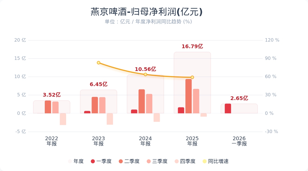 财联社4月23日电,燕京啤酒(000729.SZ)公告称,2026年第一季度实现营业收入40.97亿元,同比增长7.06%;归属于上市公司股东的净利润为2.65亿元,同比增长60.19%。业绩变动主要系公司坚持价值引领、聚焦高质量发展的战略布局,精准洞察消费升级与市场需求变化,持续推进产品高端化进程。公司持续强化渠道精耕与品牌建设,不断提升市场覆盖与品牌影响力,推进精细化运营管理,有效提升运营效率与盈利水平。核心大单品燕京U8持续领跑,3月底高端全麦新品燕京A10上市,产品优势进一步夯实。小财注:公司Q1净利润2.65亿,2025年Q4净利润-0.91亿,据此计算,Q1净利润环比扭亏为盈。