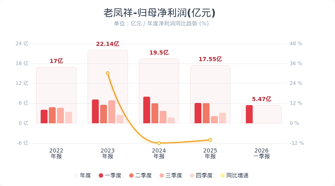 财联社4月23日电,老凤祥(600612.SH)公告称,2026年第一季度实现营业收入137.42亿元,同比下降21.57%;归属于上市公司股东的净利润为5.47亿元,同比下降10.76%。小财注:公司Q1净利润5.47亿,据2025年业绩快报估算,2025年Q4净利润3.17亿,据此计算,Q1净利润环比增长72%。