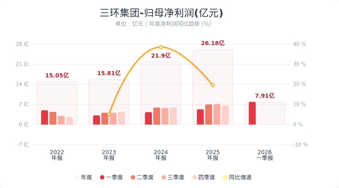 财联社4月23日电,三环集团(300408.SZ)公告称,2026年第一季度实现营业收入26.81亿元,同比增长46.25%;归属于上市公司股东的净利润为7.91亿元,同比增长48.48%。业绩变动主要系报告期内,受益于公司MLCC产品客户认可度持续提升以及光通信等行业需求增长,公司营业收入同比大幅增长。小财注:公司Q1净利润7.91亿,2025年Q4净利润6.6亿,据此计算,Q1净利润环比增长19%。