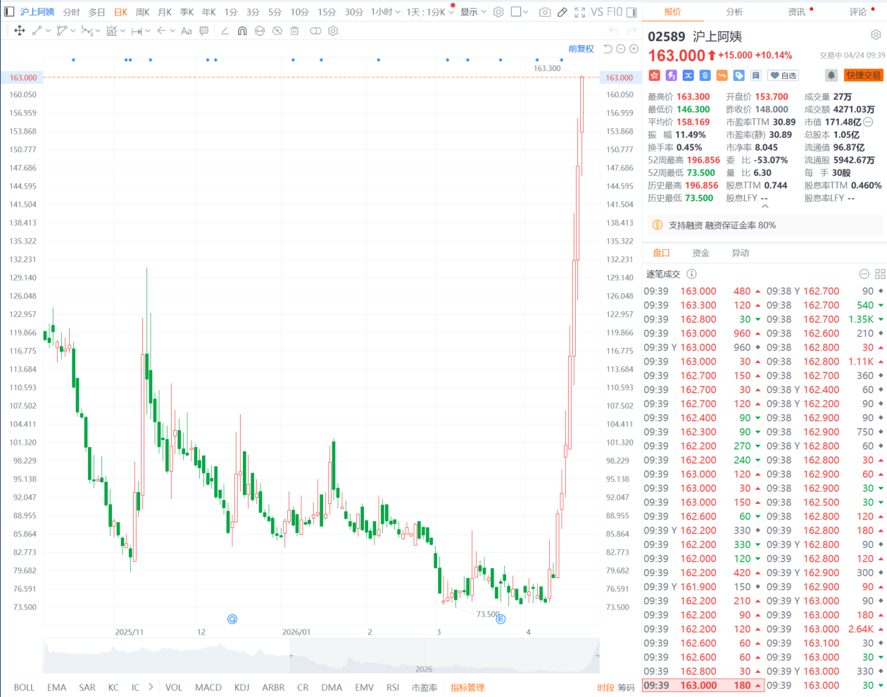 财联社4月24日电,沪上阿姨盘初涨幅迅速扩大至10%,7个交易日累计涨幅近100%。