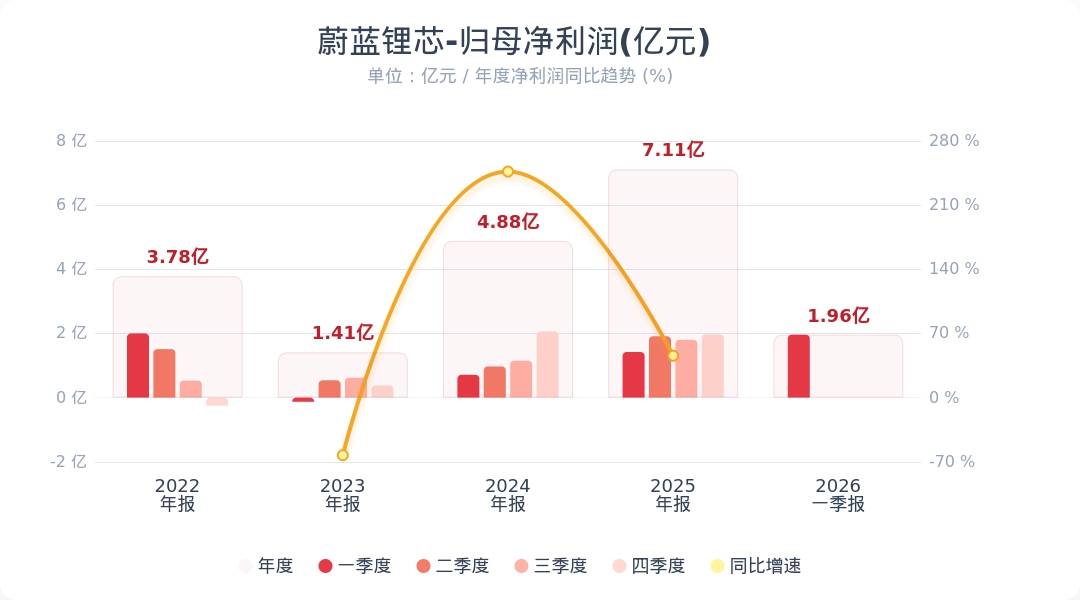 财联社4月24日电,蔚蓝锂芯(002245.SZ)公告称,2026年第一季度实现营业收入21.53亿元,同比增长24.60%;归属于上市公司股东的净利润为1.96亿元,同比增长38.14%。业绩变动主要系报告期内公司各项业务经营情况良好,整体业绩较上年同期增长。小财注:公司Q1净利润1.96亿,2025年Q4净利润1.97亿,据此计算,Q1净利润环比下降0.85%。