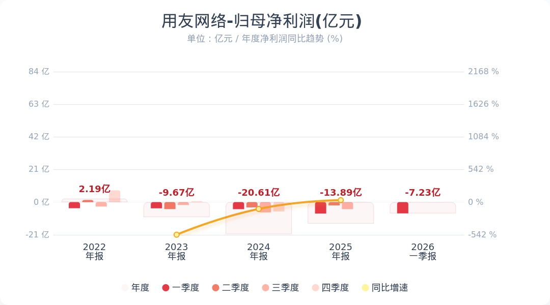 财联社4月24日电,用友网络(600588.SH)公告称,2026年第一季度实现营业收入14.59亿元,同比增长5.90%;归属于上市公司股东的净利润为-7.23亿元。小财注:公司Q1净利润-7.23亿,2025年Q4净利润0.09亿,据此计算,Q1净利润环比由盈转亏。