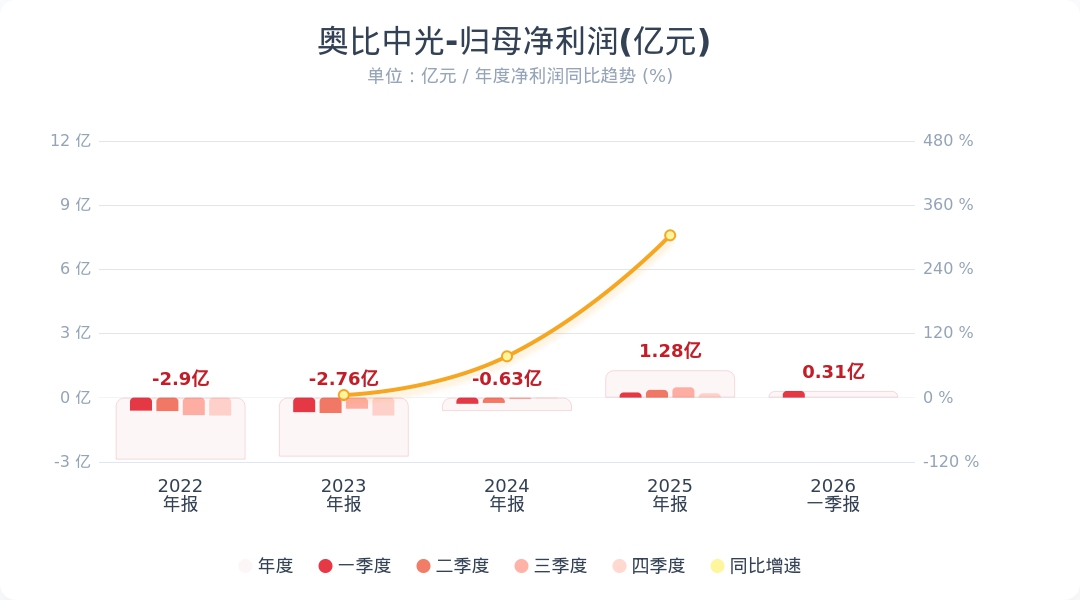 《科创板日报》24日讯,奥比中光(688322.SH)公告称,2026年第一季度实现营业收入2.03亿元,同比增长6.19%;归属于上市公司股东的净利润为3099.66万元,同比增长27.48%。业绩变动主要系高毛利率业务占比提升与业务结构持续升级,盈利水平与盈利质量同步跃升所致。小财注:公司Q1净利润0.31亿,2025年Q4净利润0.2亿,据此计算,Q1净利润环比增长55%。