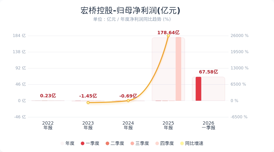 财联社4月24日电,宏桥控股(002379.SZ)公告称,2026年第一季度实现营业收入409.33亿元,同比增长3.21%;归属于上市公司股东的净利润为67.58亿元,同比增长37.56%。业绩变动主要系本期铝价上涨,促使公司毛利润上升,同时财务费用同比减少所致。小财注:公司Q1净利润67.58亿,2025年Q4净利润180.33亿,据此计算,Q1净利润环比下降62%。