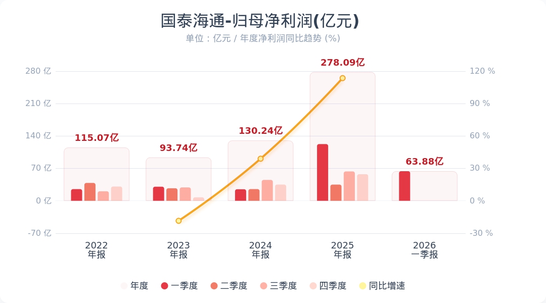 财联社4月24日电,国泰海通(601211.SH)公告称,2026年第一季度实现营业收入162.32亿元,同比增长58.91%;扣非归母净利润57.11亿元,同比增长73.43%。业绩变动主要是一季度资本市场交投活跃,公司各项业务稳步发展,以及上年同期吸收合并海通证券后,集团业务规模扩大;利润总额、归属于母公司所有者的净利润等部分财务指标同比下降,主要是由于上年同期吸收合并海通证券产生负商誉,使得上年同期营业外收入较高。小财注:公司Q1净利润63.88亿,2025年Q4净利润57.35亿,据此计算,Q1净利润环比增长11%。