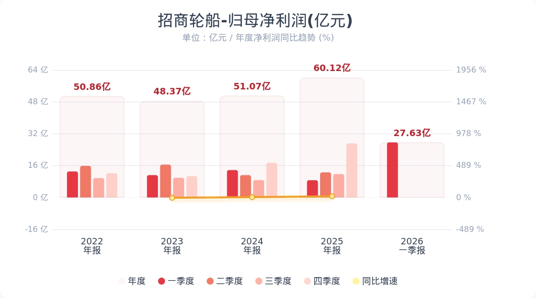 财联社4月24日电,招商轮船(601872.SH)公告称,2026年第一季度实现营业收入85.56亿元,同比增长52.92%;归属于上市公司股东的净利润为27.63亿元,同比增长219.31%。业绩变动主要系油轮板块受供需结构改善及地缘等影响,运价中枢继续上升;干散货板块BDI指数同比大幅上升所致。小财注:公司Q1净利润27.63亿,2025年Q4净利润27.12亿,据此计算,Q1净利润环比增长1%。