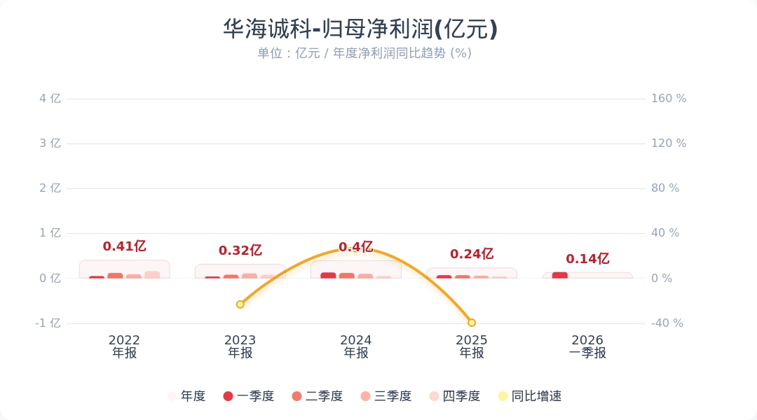 《科创板日报》27日讯,华海诚科(688535.SH)公告称,2026年第一季度实现营业收入2.23亿元,同比增长165.58%;归属于上市公司股东的净利润为1352.71万元,同比增长87.65%。业绩变动主要系新增子公司纳入合并范围,整体销售订单规模稳步增长所致。小财注:公司Q1净利润0.14亿,2025年Q4净利润0.04亿,据此计算,Q1净利润环比增长221%。