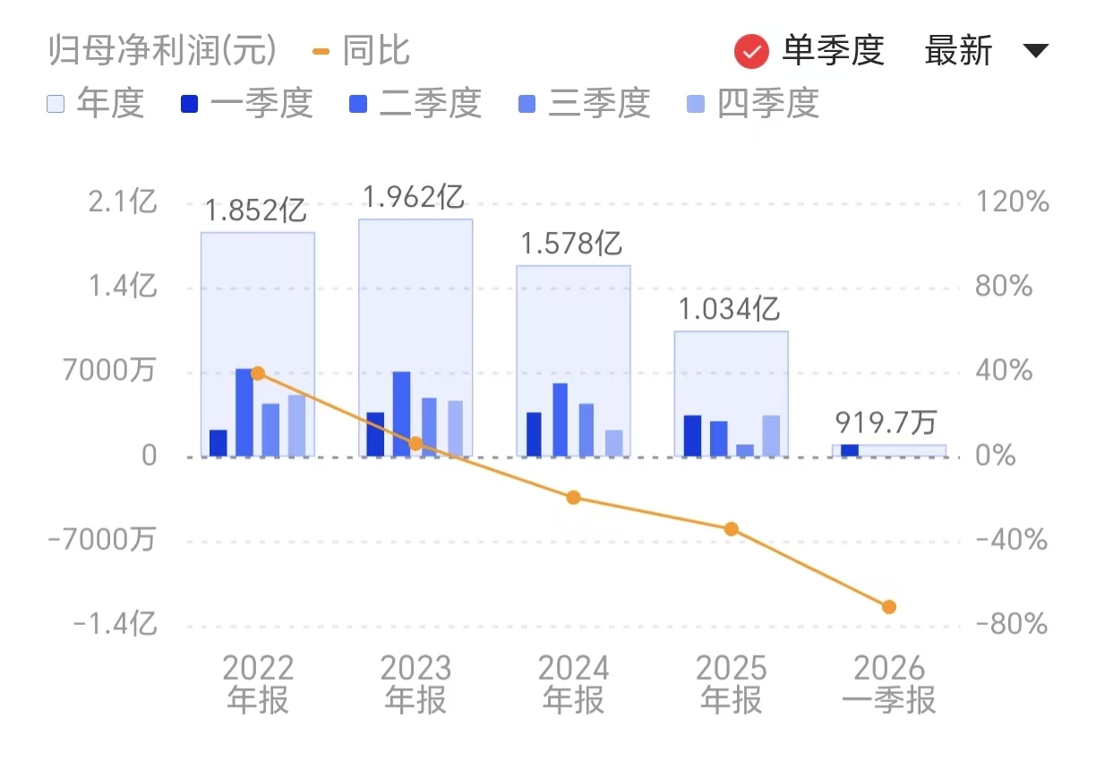 财联社4月27日电,西部材料(002149.SZ)公告称,2026年第一季度实现营业收入6.03亿元,同比下降20.04%;归属于上市公司股东的净利润为919.68万元,同比下降71.40%。业绩变动主要是由于:1、钛制品、金属复合板订单下降营业收入减少;2、产品结构中附加值高的钛合金产品占比下降。小财注:公司2025年Q4净利润3411.43万,据此计算,2026年Q1净利润环比下降73%。
