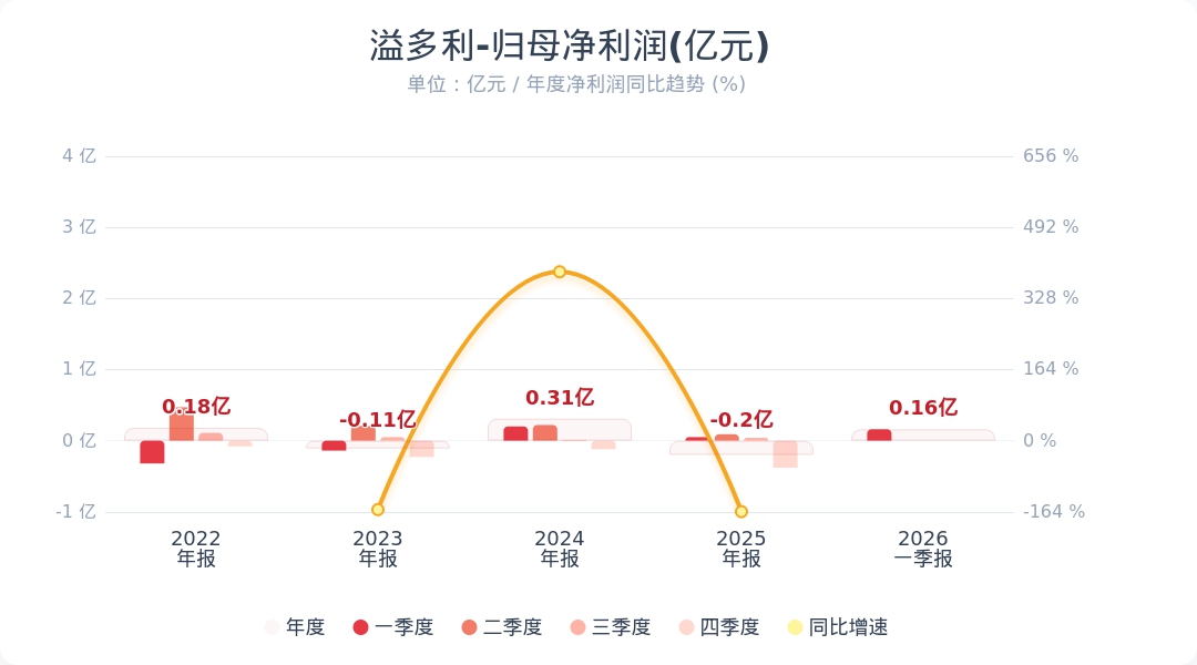 财联社4月28日电,溢多利(300381.SZ)公告称,2026年第一季度实现营业收入2.13亿元,同比增长5.06%;归属于上市公司股东的净利润为1648.54万元,同比增长238.47%。业绩变动主要系报告期内营业收入增长带动毛利增加、收到政府补助和证券投资的公允价值变动产生收益增加、计提信用减值及固定资产报废损失减少所致。小财注:公司Q1净利润0.16亿,2025年Q4净利润-0.38亿,据此计算,Q1净利润环比扭亏为盈。
