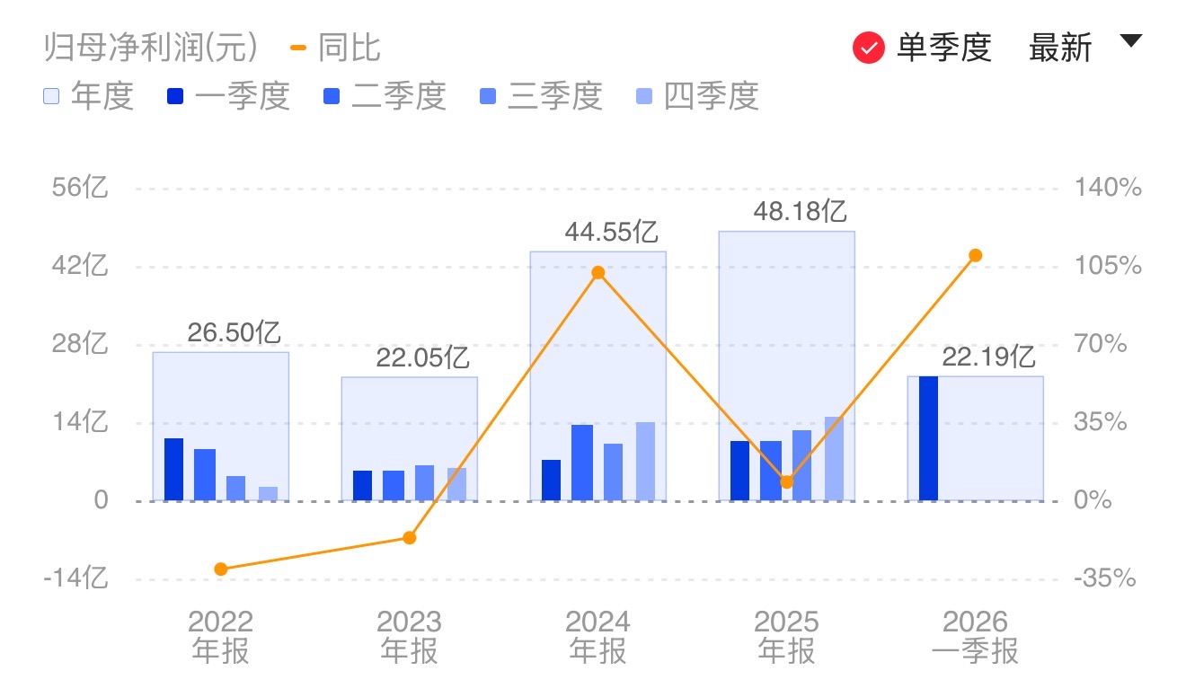 财联社4月28日电,天山铝业(002532.SZ)公告称,一季度营业收入84.44亿元,同比增长6.55%;净利润22.2亿元,同比增长109.70%。主要为本报告期铝价上涨,公司营业收入增加。小财注:天山铝业2025年Q4净利14.78亿元,据此计算,2026年Q1净利环比增长50.15%。