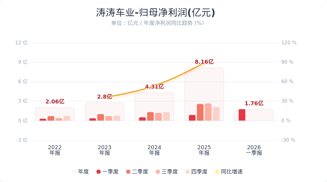 财联社4月28日电,涛涛车业(301345.SZ)公告称,2026年第一季度实现营业收入10.59亿元,同比增长65.66%;归属于上市公司股东的净利润为1.76亿元,同比增长104.50%。业绩变动主要系电动低速车销售增长所致。小财注:公司Q1净利润1.76亿,2025年Q4净利润2.1亿,据此计算,Q1净利润环比下降15%。