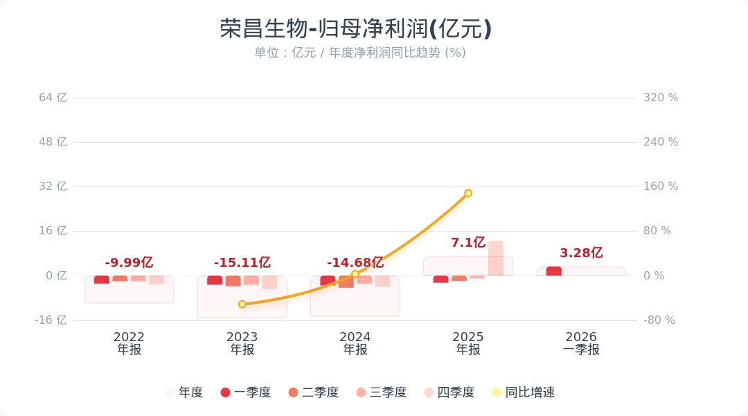 《科创板日报》28日讯,荣昌生物(688331.SH)公告称,2026年第一季度实现营业收入6.56亿元,同比增长24.76%;归属于上市公司股东的净利润为3.28亿元,同比扭亏为盈。业绩变动主要系商业化产品销售收入持续增加,以及产品技术授权导致研发投入减少,认股权证公允价值变动所致。小财注:公司Q1净利润3.28亿,2025年Q4净利润12.6亿,据此计算,Q1净利润环比下降73%。