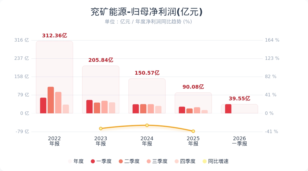财联社4月28日电,兖矿能源(600188.SH)公告称,2026年第一季度实现营业收入345.89亿元,同比增长1.83%;归属于上市公司股东的净利润为39.55亿元,同比增长42.14%。业绩变动主要系报告期内公司公开挂牌转让内蒙古鑫泰煤炭有限公司100%股权,影响归属于上市公司股东的净利润同比增加28.43亿元;煤炭产品盈利同比下降。小财注:公司Q1净利润39.55亿,2025年Q4净利润14.2亿,据此计算,Q1净利润环比增长178%。