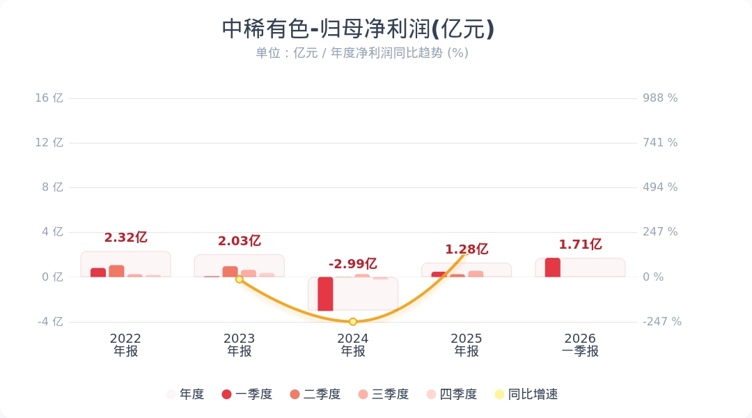 财联社4月28日电,中稀有色(600259.SH)公告称,2026年第一季度实现营业收入15.35亿元,同比增长1.90%;归属于上市公司股东的净利润为1.71亿元,同比增长261.55%。业绩变动主要系2026年一季度稀土市场行情整体上涨,公司强化市场研判,并进一步统筹稀土业务采购及销售协同,稀土产品业绩稳步提升,实现预期利润。同时持续加强亏损企业治理,亏损企业同比实现减亏;公司参股企业大宝山公司保持稳产高产,铜硫钨产品产销量及价格均实现同比增长,企业盈利增加,公司按权益法核算的投资收益金额增加。小财注:公司Q1净利润1.71亿,2025年Q4净利润-0.0亿,据此计算,Q1净利润环比扭亏为盈。