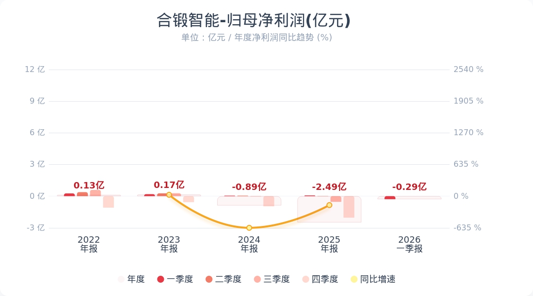 财联社4月28日电,合锻智能(603011.SH)公告称,2026年第一季度实现营业收入4.05亿元,同比下降3.71%;归属于上市公司股东的净利润亏损2868.47万元,上年同期盈利739.24万元,同比转亏。业绩变动主要系母公司亏损加大所致,母公司亏损加大主要是毛利率下滑及鉴于毛利率下滑等原因,增加计提存货等资产减值准备。小财注:公司Q1净利润-0.29亿,2025年Q4净利润-2.04亿,据此计算,Q1净利润环比持续亏损。