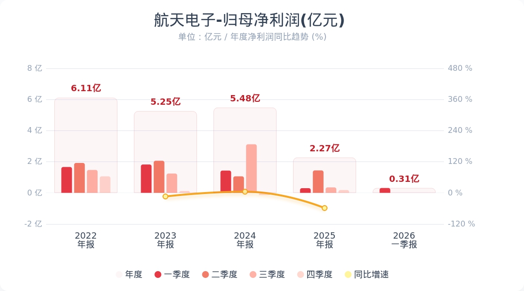 财联社4月28日电,航天电子(600879.SH)公告称,2026年第一季度实现营业收入18.43亿元,同比增长8.37%;归属于上市公司股东的净利润为3127.79万元,同比增长5.25%。业绩变动主要系本报告期归属于上市公司股东的净利润增加所致。小财注:公司Q1净利润0.31亿,2025年Q4净利润0.18亿,据此计算,Q1净利润环比增长75%。