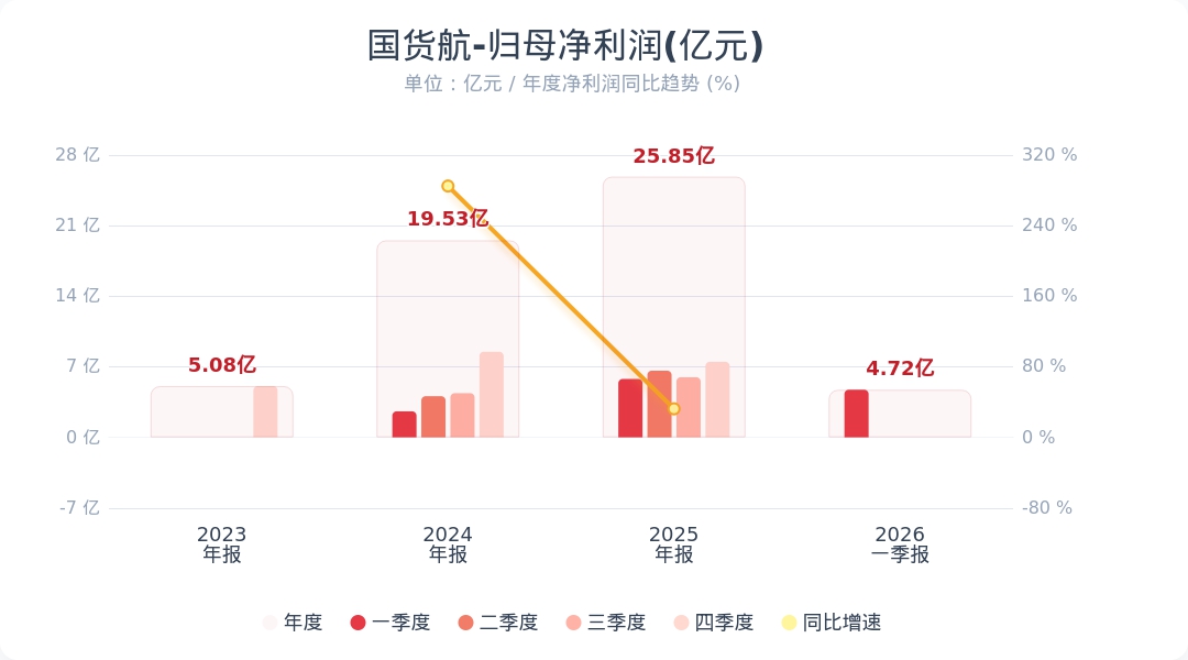 财联社4月28日电,国货航(001391.SZ)公告称,2026年第一季度实现营业收入52.20亿元,同比增长0.73%;归属于上市公司股东的净利润为4.72亿元,同比下降18.45%。业绩变动主要系航空货运服务业务毛利同比下降所致。小财注:公司Q1净利润4.72亿,2025年Q4净利润7.49亿,据此计算,Q1净利润环比下降36%。