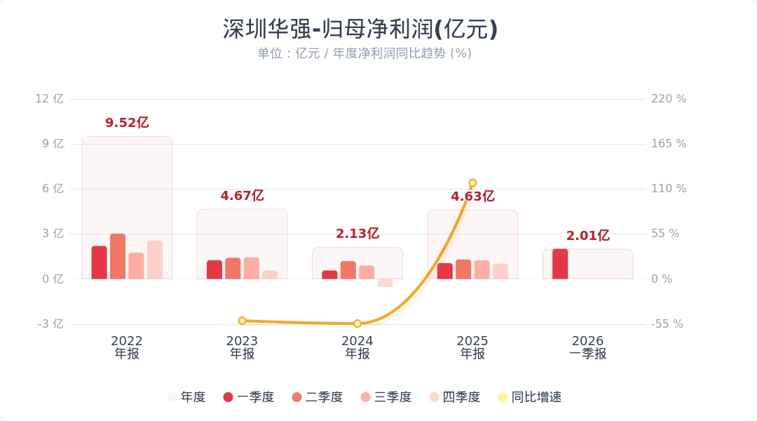 财联社4月28日电,深圳华强(000062.SZ)公告称,2026年第一季度实现营业收入77.01亿元,同比增长47.28%;归属于上市公司股东的净利润为2.01亿元,同比增长90.28%。业绩变动主要系公司持续把握AI快速发展、存储需求增加等机遇,深化与上游厂商合作,推动电子元器件授权分销业务收入增长,其中存储类产品线出货额同比增幅约250%;同时,电子元器件长尾采购业务收入同比大幅增长,增幅超300%。小财注:公司Q1净利润2.01亿,2025年Q4净利润1.02亿,据此计算,Q1净利润环比增长97%。