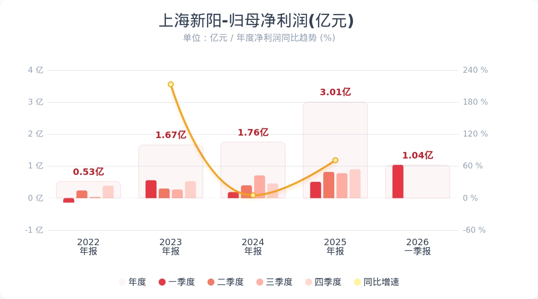 财联社4月28日电,上海新阳(300236.SZ)公告称,2026年第一季度实现营业收入5.77亿元,同比增长33.05%;归属于上市公司股东的净利润为1.04亿元,同比增长102.59%。业绩变动主要系本报告期公司集成电路材料销售收入增加所致。小财注:公司Q1净利润1.04亿,2025年Q4净利润0.9亿,据此计算,Q1净利润环比增长15%。